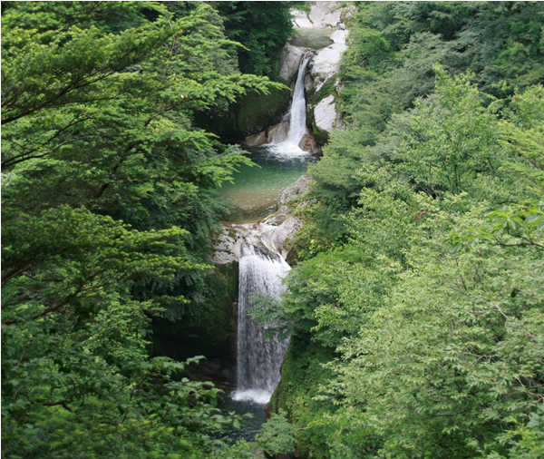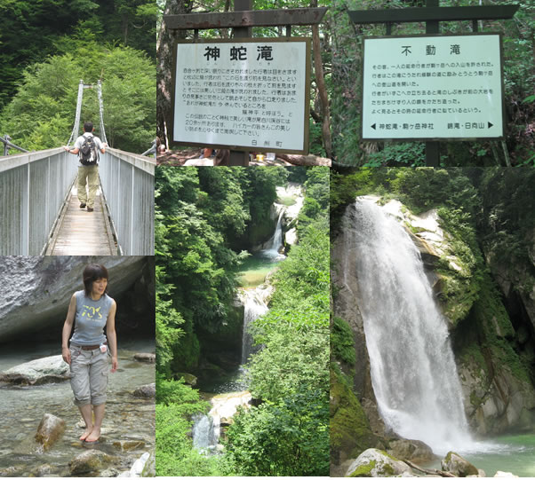 神蛇滝(左画像)は南アルプスの滝らしかぬ品格のある滝、不動滝(右画像)は、