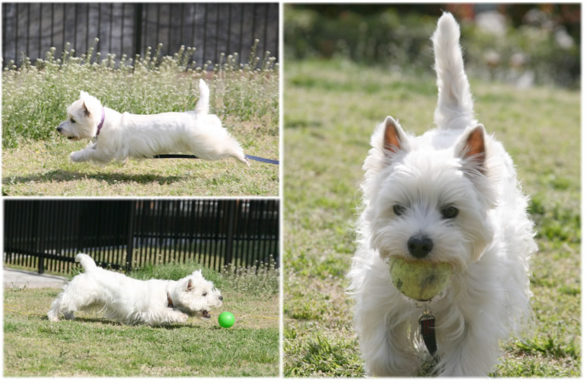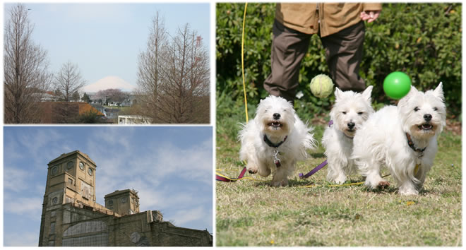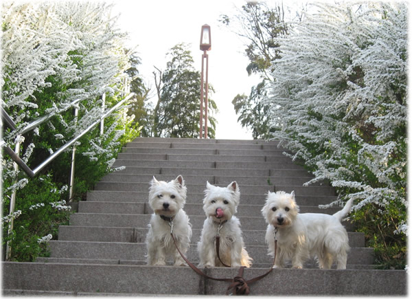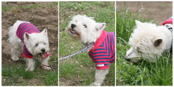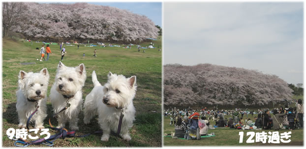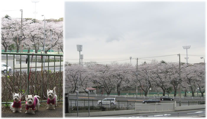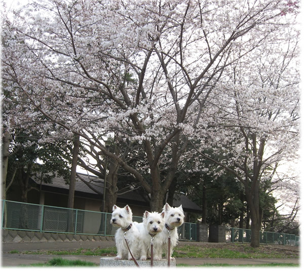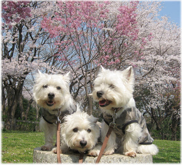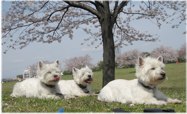 途中、桜の木のない広場に行ったら、新しい草を食べることに夢中な3ワンコ。