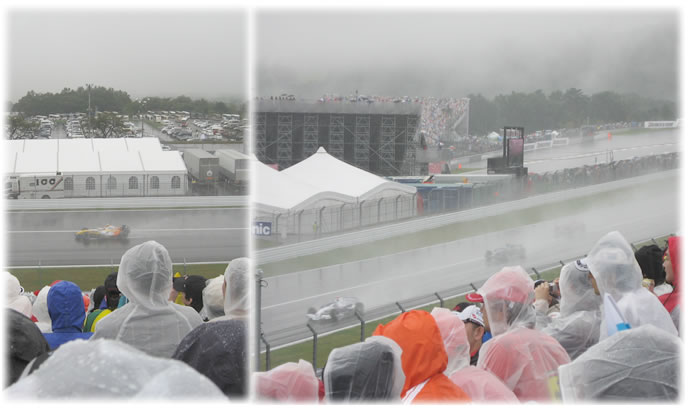 この時点で、既に全身びしょ濡れ。レース観戦中はもちろん傘は差せません。