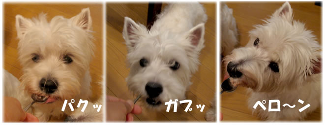スプーンで何か食べ始めると必ず群がってくるワンコたち。
