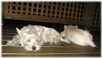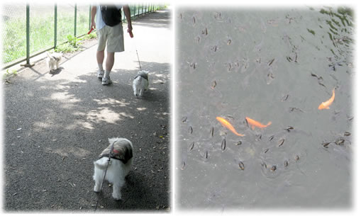 汚れた川ですが、鯉が一杯。じめじめした暑い陽気にワンコたちはバテ気味。