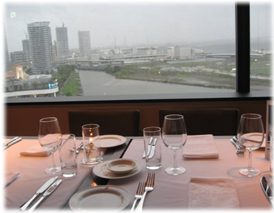 本来なら素敵な夜景が。。。雨に濡れる窓の向こうにはベイブリッジ。