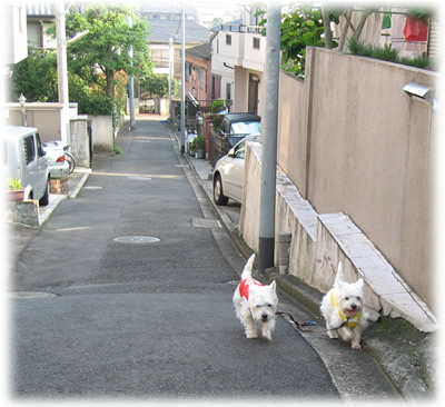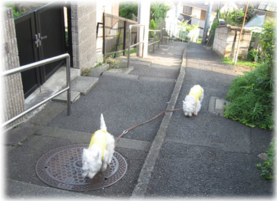 ワンコたちは主人と散歩、近くのお寺にて。