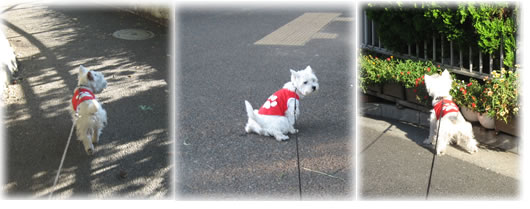 レッドの蚊除けTシャツを着て、早朝散歩するのはモナコだけです。