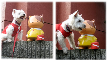 ブロック塀の上にいるお人形さんと写真を撮りました。